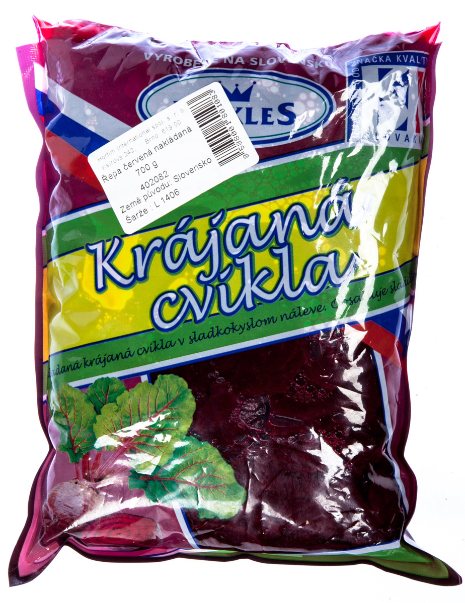 - Nakládaná červená řepa, nálev (voda, ocet kvasný lihový, jedlá sůl, sladidlo: E955 sukraloza, konzervační látka: E211 benzoan sodný)