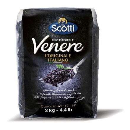 - Střednězrnná celozrnná předvařená černá rýže Venere.