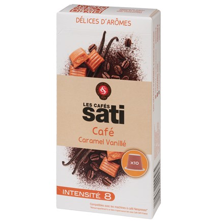 - Kapsle Sati Arabica – Caramel Vanillé Vybraná Arabica aromatizovaná příchutí vanilkového karamelu. Nechte se unést espressem plným charakteru s vůní vzdálených ostrovů.