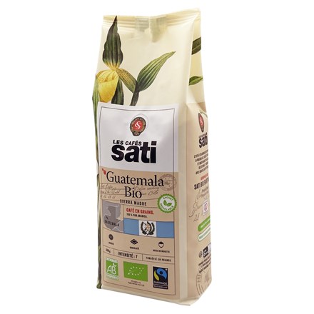 - SATI Guatemala Sierra Madre Bio Fairtrade. Tato čistá Arabica původem ze Západní Guatemaly splňuje označení „přísně tvrdá zrna“, což svědčí o její kvalitě vysokohorské kávy nad 1600 metrů n.m.. Káva je silná a sametová, má jemnou kyselost. Nabízí příjemnou perzistenci v ústech s tóny čokolády a lískových oříšků. Zcela recyklovatelný obal bez hliníku. Les Cafés Sati je francouzská rodinná a nezávislá společnost, založená v roce 1926 ve Štrasburku v Alsasku.