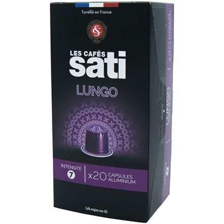 - Kapsle Sati Lungo - Výběrová 100% Arabica z Latinské Ameriky namíchána, upražena a umleta speciálně pro větší šálky formátu lungo. Aromatická lehká káva s příjemně ovocnými tóny a kulatostí na patře. Kapsle jsou hliníkové. Les Cafés Sati je francouzská rodinná a nezávislá společnost, založená v roce 1926 ve Štrasburku v Alsasku.
