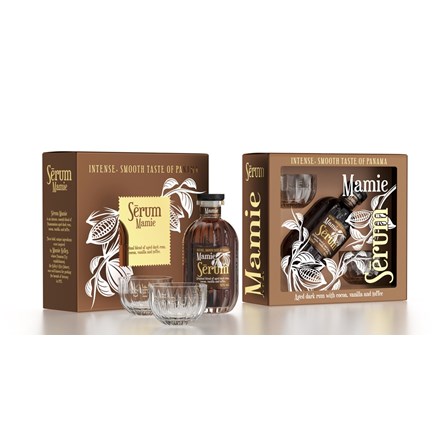 - Serum Mamie je panamský rum s kakaovými boby, vanilkou a toffee. Nabízí jemnou, sladce kořeněnou chuť a elegantní vzhled s designovými skleničkami, takže je ideální jako dárek i pro milovníky prémiových rumů.