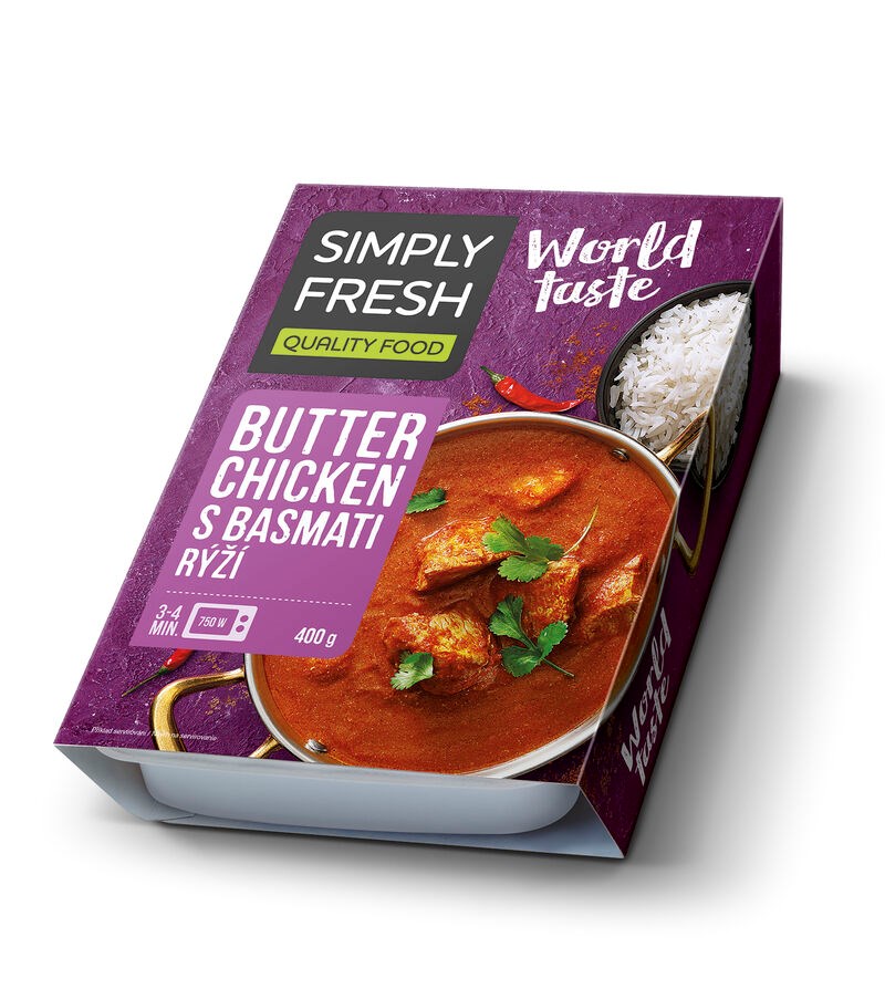 - Voda, rýže basmati 19 %, rajčata-polotovar (rajčata, rajčatová šťáva, regulátor kyselosti: kyselina citronová), kuřecí maso (17,5 %), cibule, SMETANA, řepkový olej, MÁSLO (1,9 %), koření (římský kmín, pepř, koriandr, paprika sladká, kardamom, hřebíček, kmín, muškátový květ, zázvor, muškátový ořech, kurkuma(0,1 %), chilli (0,02 %), skořice), sůl, cukr, jogurt (MLÉKO, sušené odstředěné MLÉKO, jogurtová kultura), modifikovaný škrob, sušený česnek, citronový koncentrát. Může obsahovat stopy PŠENICE, SÓJI, VAJEC, ARAŠÍDŮ, CELERU.