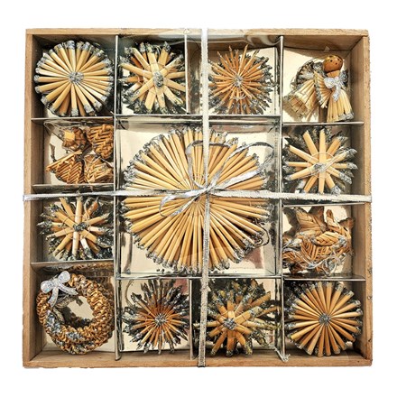 - Slaměné dekorace se stříbrným glitrem v dřevěné krabičce 56 ks