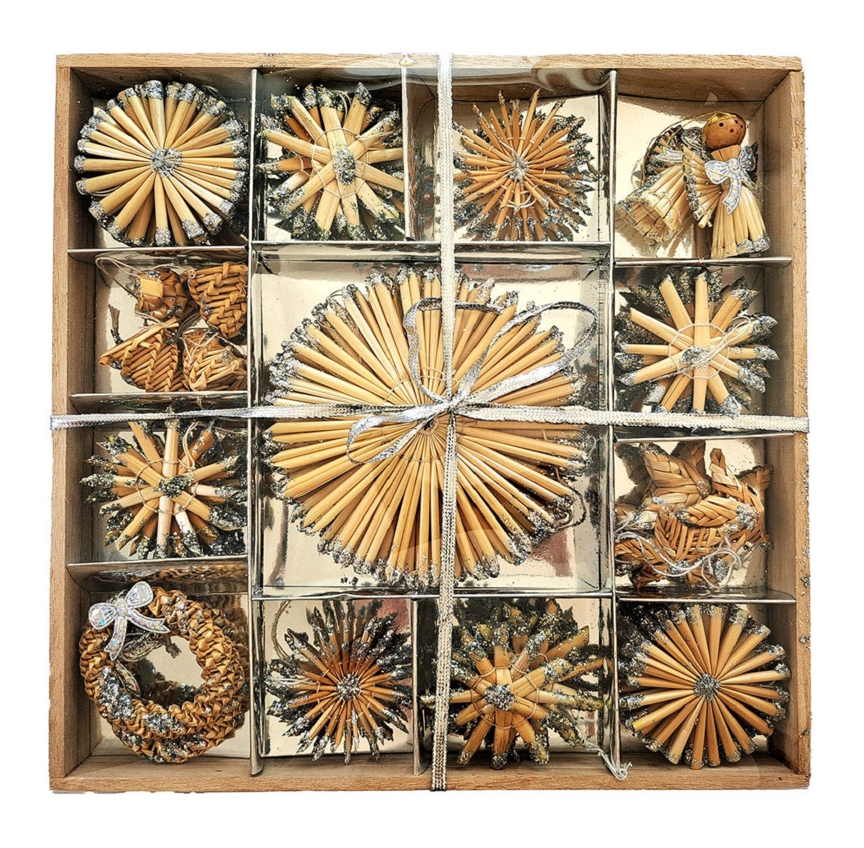 - Slaměné dekorace se stříbrným glitrem v dřevěné krabičce 56 ks