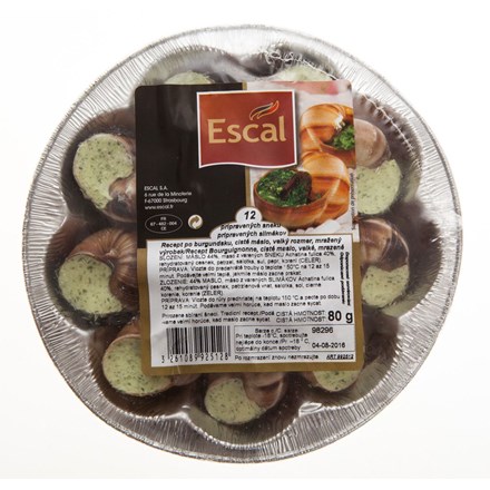 - 12 achatinových masových kousků ve skořápkách druhu Helix, připravené s máslem, parlic a petrželkou, hluboko zmrazené.