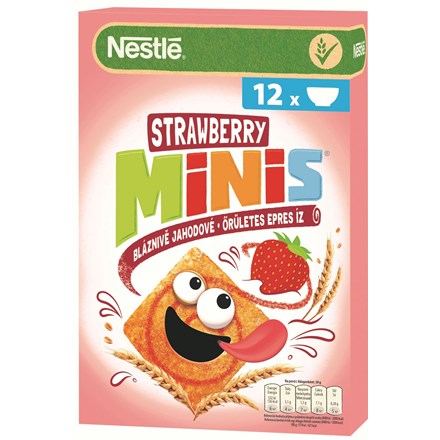 - Cereální čtverečky s chutí jahod. Extrudovaný výrobek.