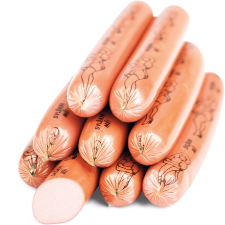 - Kuřecí maso strojně oddělené 70 %, voda, kuřecí kůže, bramborový škrob, jedlá sůl, konzervant dusitan sodný, stabilizátory: trifosforečnany, cukr, koření, antioxidant kyselina erythorbová, extrakty koření, aroma, paprikový extrakt.