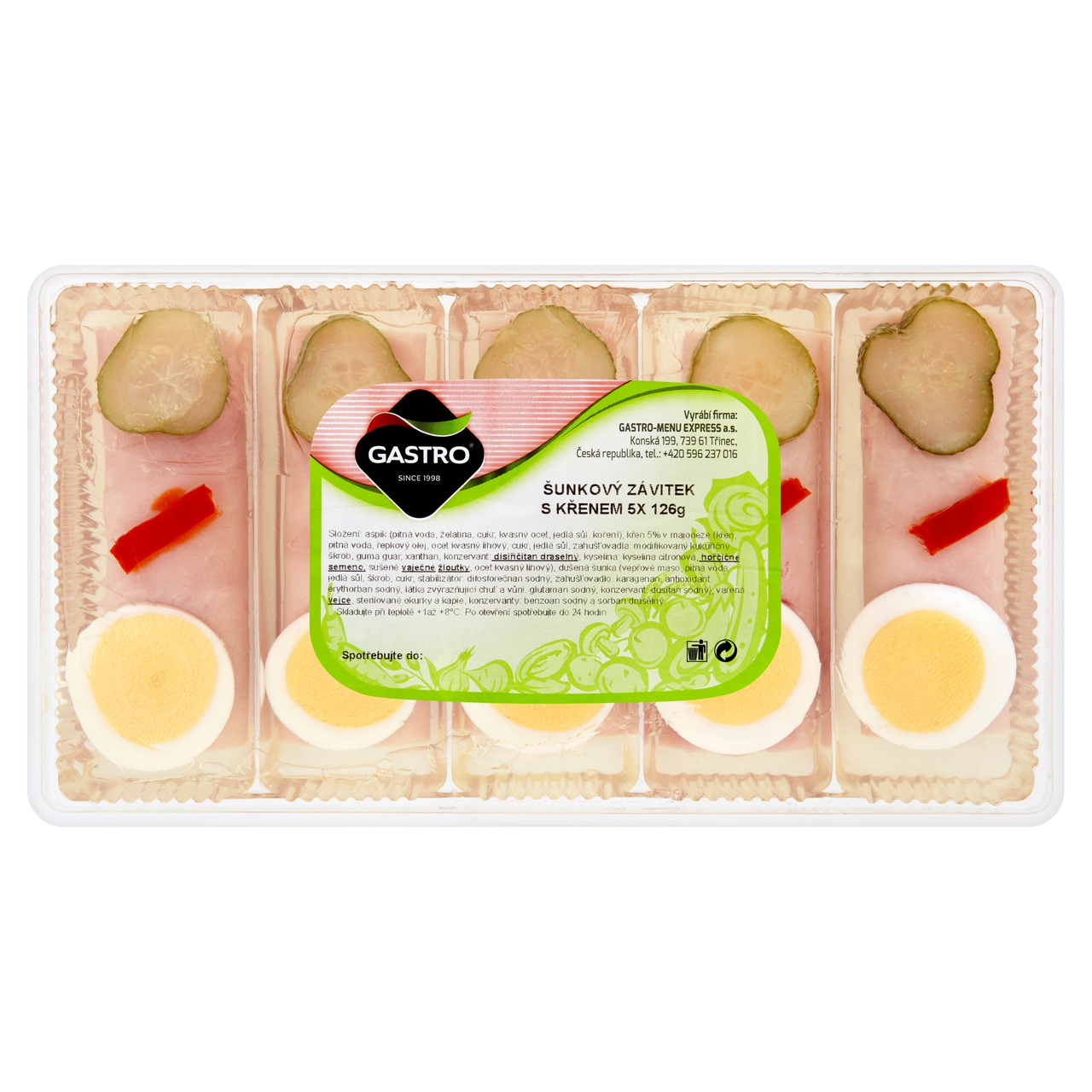 - Aspik (pitná voda, želatina, cukr, kvasný ocet, jedlá sůl, koření), křen v majonéze (majonéza (rostl. olej, VEJCE, modifik. škrob kukuřičný, semínko HOŘČICE, stabilizátory guar guma a xanthan, beta-karoten), steril. křen min.3% (křen, solvarin AP, kys. citr., DISIŘIČITAN draselný), šunka min.15% (vepř. maso, kůžová emulze, bram.a kukuř. škrob, dus. sodný, látka protispék. Hexakyanoželeznatan sodný, uhličitan sodný, di-tri-poly-fosforečnan, keragenan, chlorid draselný, karminy, glutaman sodný), VEJCE okurky steril., kapie steril., konzervant benzoan sodný, sorban draselný.