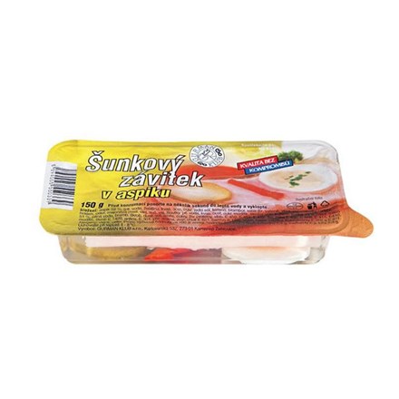 - 60% aspik (pitná voda, vepřová želatina, cukr, ocet kvasný lihový, jedlá sůl), bramborový salát [brambory vařené (brambory, antioxidant (DISIŘIČITAN draselný)), majonéza (řepkový olej, pitná voda, VAJEČNÉ žloutky, modif. bramborový škrob, zahušťovadla (guma guar, xanthan), cukr, jedlá sůl, ocet kvasný lihový), sterilovaná zelenina (okurky, mrkev, hrášek, CELER (celer, antioxidant (DISIŘIČITAN draselný)), hořčice (pitná voda, HOŘČIČNÉ semínko, ocet kvasný lihový, cukr, jedlá sůl, extrakty koření), pepř černý], 10% šunka dušená [vepřové maso, pitná voda, bramborový škrob, jedlá sůl, konzervant (dusitan sodný), zahušťovadla (guma euchema, modifikovaný bramborový škrob), cukr, stabilizátory (difosforečnany, trifosforečnany), vepřová bílkovina, antioxidant (askorban sodný), barvivo (karmíny)], 2,5 % VEJCE vařené, kapie, pažitka, konzervanty (sorban draselný, benzoan sodný).