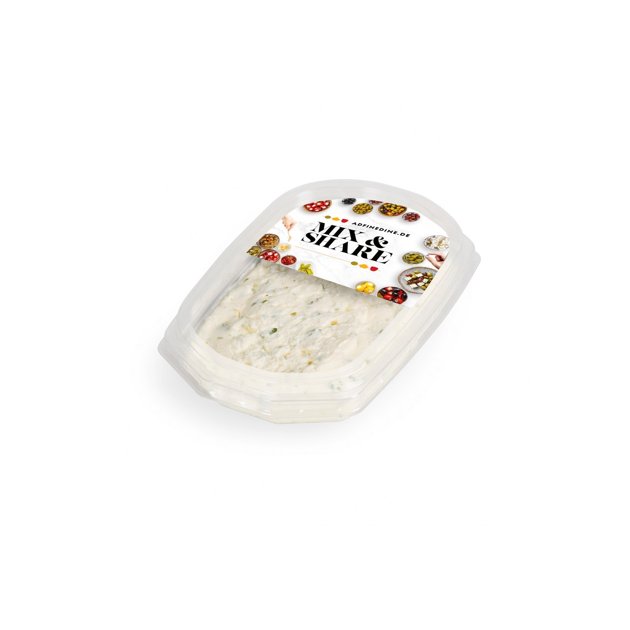 - SÝR 64 % (MLÉKO, SMETANA, tapiokový škrob, jedlá sůl, sýrařské kultury), SÝR Feta 19 % (ovčí MLÉKO, kozí MLÉKO, syřidlo, mléčné kultury, jedlá sůl, zpevňující látka: chlorid vápenatý), řepkový olej, petržel, česnek, jedlá sůl.