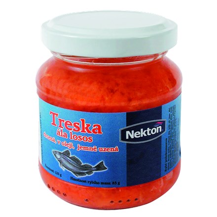 - Treska aljašská - drcená 68%, solená (treska aljašská - Theragra chalcogramma), jedlá sůl 6,9%, kvasný lihový ocet, konzervant: benzoan sodný, barviva: E110, E124 - mohou nepříznivě ovlivňovat činnost a pozornost dětí, kouřové aroma), řepkový olej 32%.