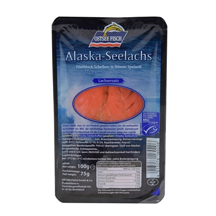 - Treska aljašská - plátky, solená (treska aljašská -Theragra chalcogramma) 75%, jedlá sůl 7,5%, kvasný lihový ocet, konzervant: benzoan sodný, barviva: E110, E124 - mohou nepříznivě ovlivňovat činnost a pozornost dětí, kouřové aroma), řepkový olej 25%.
