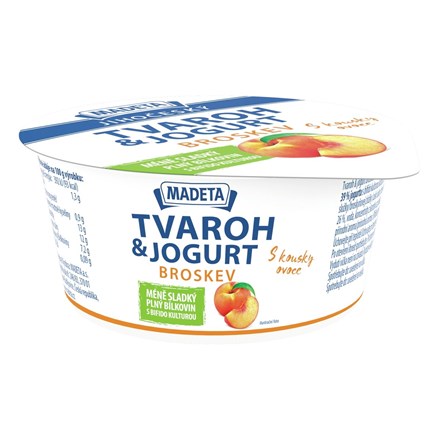 - tvaroh, smetana, 20 % jogurtu s bifido kulturou, 17 % broskvové složky (cukr, broskve 26 %,voda, koncentráty z karotky a z jablka, aroma)