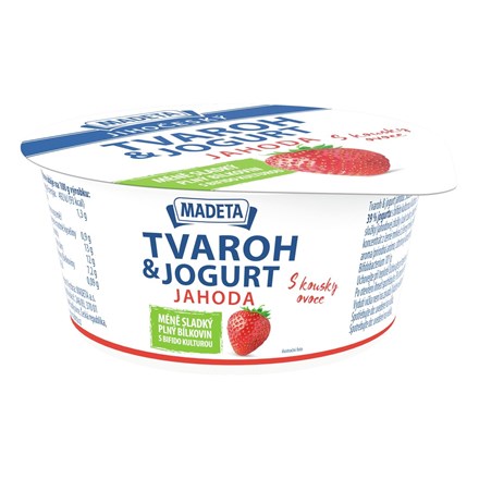 - tvaroh, smetana, 20 % jogurtu s bifido kulturou, 17 % jahodové složky (cukr, jahody 44 %,glukózo-fruktózový sirup, koncentrát z černé mrkve, aroma)