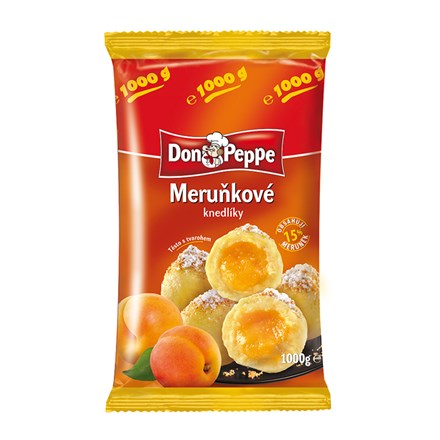 - pitná voda, bramborové těsto 22,9% (PŠENIČNÁ mouka, sušené bramborové vločky, PŠENIČNÁ krupice, bramborový škrob, jedlá sůl, kurkuma), meruňky 15,2%, PŠENIČNÁ mouka, TVAROH 11,4%, cukr, rostlinný margarín (palmový tuk, řepkový, slunečnicový olej v různých poměrech, pitná voda, emulgátor: slunečnicový lecithin, citrónová šťáva), zahušťovadlo: modifikovaný škrob, jedlá sůl, MLÉČNÉ bílkoviny, bramborová vláknina.