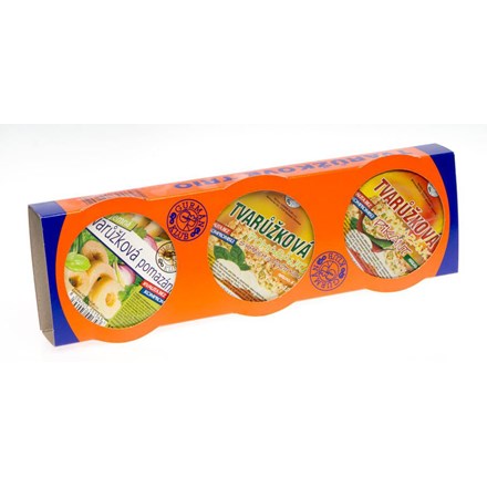 - Jemná tvarůžková pomazánka 120g: majonéza (řepkový olej, pitná voda, VAJEČNÉ žloutky, modifikovaný brambor. škrob, zahušťovadla (guma guar, xanthan), cukr, jedlá sůl, ocet kvasný lihový), margarin [rostlinné tuky (palmový, palmojádrový) a oleje (řepkový), pitná voda, emulgátory (E471, E475), slunečnicový lecithin), regulátor kyselosti (kyselina citronová), aroma, barvivo (karoteny)), 30% olomoucké tvarůžky (TVAROH, jedlá sůl, regulátory kyselosti (uhličitan vápenatý, uhličitany sodné), mlékařské kultury, pitná voda), tavicí soli (difosforečnany, trifosforečnany)], marinovaná cibule (cibule, konzervant (DISIŘIČITAN draselný), pažitka, konzervanty (benzoan sodný, sorban draselný).; Tvarůžková pomazánka pikant 120g: salám [drůbeží maso strojně oddělené, pitná voda, vepřové kůže, bramborový škrob, jedlá sůl, česnek, koření, dextróza, maltodextrin, cukr, vepřová bílkovina, stabilizátory (E450, E451), barvoivo (karmíny)], margarin [rostlinné tuky (palmový, palmojádrový) a oleje (řepkový), pitná voda, emulgátory (E471, E475), slunečnicový lecithin), regulátor kyselosti (kyselina citronová), aroma, barvivo (karoteny)),19 % olomoucké tvarůžky [( TVAROH, jedlá sůl, regulátory kyselosti (uhličitany vápenaté, uhličitany sodné), mlékařské kultury, pitná voda), tavicí soli (difosforečnany, trifosforečnany)], majonéza [řepkový olej, pitná voda, VAJEČNÉ žloutky, modifikovaný bramborový škrob, zahušťovadla (guma guar, xanthan), cukr, jedlá sůl, ocet kvasný lihový], marinovaná cibule (cibule, konzarvant (DISIŘIČITAN draselný)), pažitka, feferony, kapie, konzervanty (benzoan sodný, sorban draselný).; Tvarůžková pomazánka s kmínem a pažitkou 120g: majonéza (řepkový olej, pitná voda, VAJEČNÉ žloutky, modifikovaný brambor. škrob, zahušťovadla (guma guar, xanthan), cukr, jedlá sůl, ocet kvasný lihový), margarin [rostlinné tuky (palmový, palmojádrový) a oleje (řepkový), pitná voda, emulgátory (E471, E475), slunečnicový lecithin), regulátor kyselosti (kyselina citronová), aroma, barvivo (karoteny)), 29% olomoucké tvarůžky (TVAROH, jedlá sůl, regulátory kyselosti (uhličitan vápenatý, uhličitany sodné), mlékařské kultury, pitná voda), tavicí soli (difosforečnany, trifosforečnany)], marinovaná cibule (cibule, konzervant (DISIŘIČITAN draselný)), 2% kmín, 1% pažitka, konzervanty (benzoan sodný, sorban draselný).