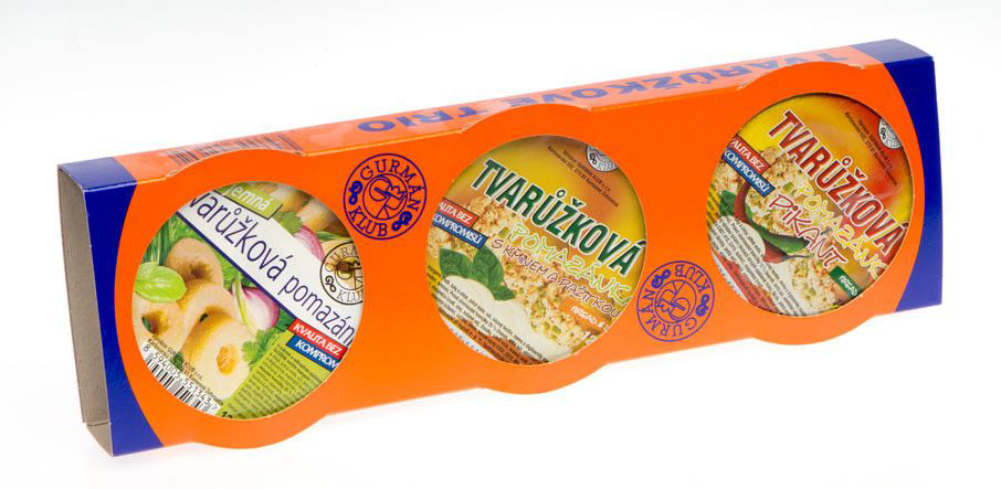 - Složení se liší podle varianty. Jemná (s pažitkou): Majonéza [řepkový olej, pitná voda, sušené VAJEČNÉ ŽLOUTKY, modifikovaný bramborový škrob, zahušťovadla (guma guar, xanthan), cukr, jedlá sůl, lihový ocet]; Margarín [rostlinné oleje a tuky (palmojádrový, palmový, řepkový), pitná voda, emulgátory (E471, E475, E322), jedlá sůl, regulátor kyselosti (kyselina citronová), barvivo (karoteny)]; 25 % Olomoucké TVARŮŽKY [TVAROH, jedlá sůl, regulátory kyselosti (uhličitan vápenatý, uhličitany sodné), MLÉKÁRENSKÉ kultury]; Tavený SÝR z TVARŮŽKŮ [60 % Olomoucké TVARŮŽKY, přírodní SÝRY, pitná voda, SYROVÁTKA, tavicí soli (E331, E451)]; cibule, antioxidant (METABISULFIT DRASELNÝ), pažitka; konzervanty (benzoan sodný, sorban draselný). Pikantní: Salám [strojně oddělené drůbeží maso, pitná voda, vepřové kůže, bramborový škrob, jedlá sůl, česnek, koření, dextróza, maltodextrin, cukr, vepřová bílkovina, stabilizátor (E451), barvivo (karmín), zvýrazňovač chuti (E621), konzervant (dusitany)]; Majonéza [řepkový olej, pitná voda, VAJEČNÉ ŽLOUTKY, modifikovaný bramborový škrob, zahušťovadla (guma guar, xanthan), cukr, jedlá sůl, lihový ocet]; Margarín [rostlinné oleje (palmový, řepkový, kokosový), pitná voda, emulgátory (E471, E475, lecitin), jedlá sůl, regulátor kyselosti (kyselina citronová), aroma, barvivo (beta-karoten)]; Olomoucké TVARŮŽKY (z toho 5 % tavené), TVAROH, jedlá sůl, regulátory kyselosti (uhličitan vápenatý, uhličitany sodné), MLÉKÁRENSKÉ kultury, pitná voda, tavicí soli (difosforečnany, trifosforečnany); 4 % sterilovaná cibule (cibule, konzervant SIŘIČITANY), sterilovaná červená paprika, feferony (pálivé nakládané papričky), pažitka; konzervanty (benzoan sodný, sorban draselný). S kmínem a pažitkou: Majonéza [řepkový olej, pitná voda, VAJEČNÉ ŽLOUTKY, modifikovaný bramborový škrob, zahušťovadla (guma guar, xanthan), cukr, jedlá sůl, lihový ocet]; Margarín [rostlinné oleje a tuky (palmový, řepkový, kokosový), pitná voda, emulgátory (E471, E475, E322), jedlá sůl, regulátor kyselosti (kyselina citronová), aroma, barvivo (beta-karoten)]; 29 % Olomoucké TVARŮŽKY (z toho 5 % tavené), TVAROH, jedlá sůl, regulátory kyselosti (uhličitan vápenatý, uhličitany sodné), MLÉKÁRENSKÉ kultury, pitná voda, tavicí soli (difosforečnany, trifosforečnany); sterilovaná cibule (cibule, konzervant SIŘIČITANY); 2 % kmín, 1 % pažitka; konzervanty (benzoan sodný, sorban draselný).