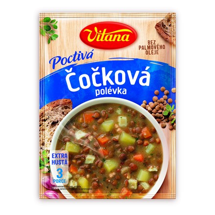 - Složení suché směsi: předvařená čočka (celá a mletá) 53 %, zelenina (brambory, česnek mletý 2,8 %, cibule 2,4 %, celer kořen, karotka), škrob, pšeničná mouka, jedlá sůl, škvařená vepřová slanina, uzené vepřové maso 3,2 %, kuřecí maso, sójový hydrolyzátmajoránka 0,7 %, cukr, barviva (amoniakový karamel, riboflavin), vepřové sádlo, vaječný bílek, pepř černý mletý, pekařské droždí