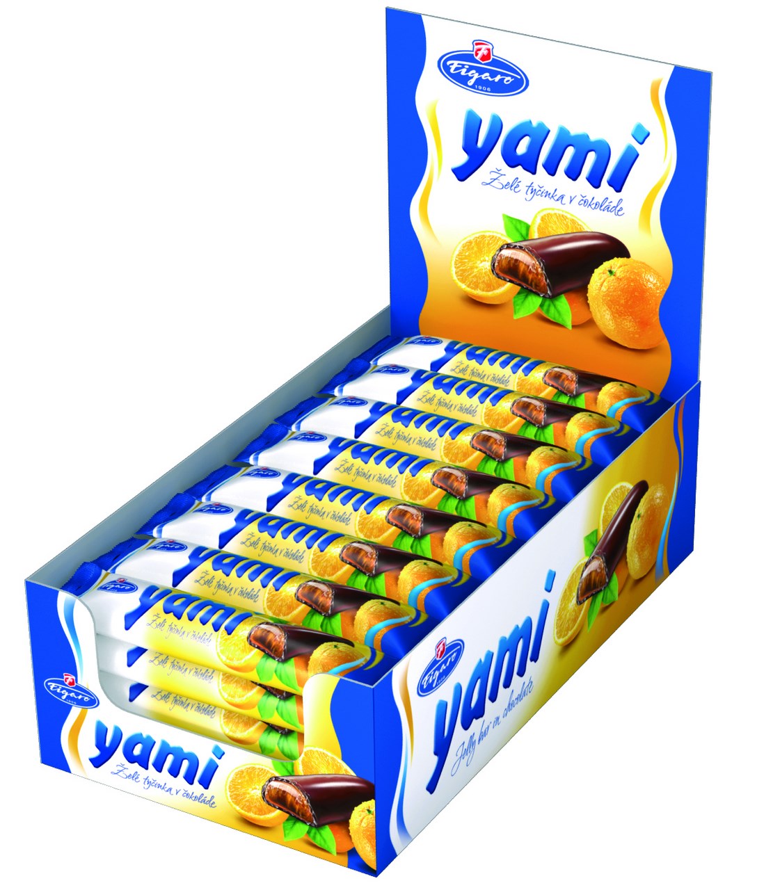 - Cukr, hořká čokoláda 18% (cukr, kakaová hmota, kakaové máslo, emulgátory fosfatid amonný, a E476, aroma), glukózový sirup, kandovaná pomerančová kůra 12% (pomerančová kůra 52%, cukr, glukózový sirup, kyselina: kyselina citrónová, sůl), želírovací látka (pektin), regulátor kyselosti (kyselina citrónová, citran sodný), přírodní aroma (pomerančové). Může obsahovat mléko.