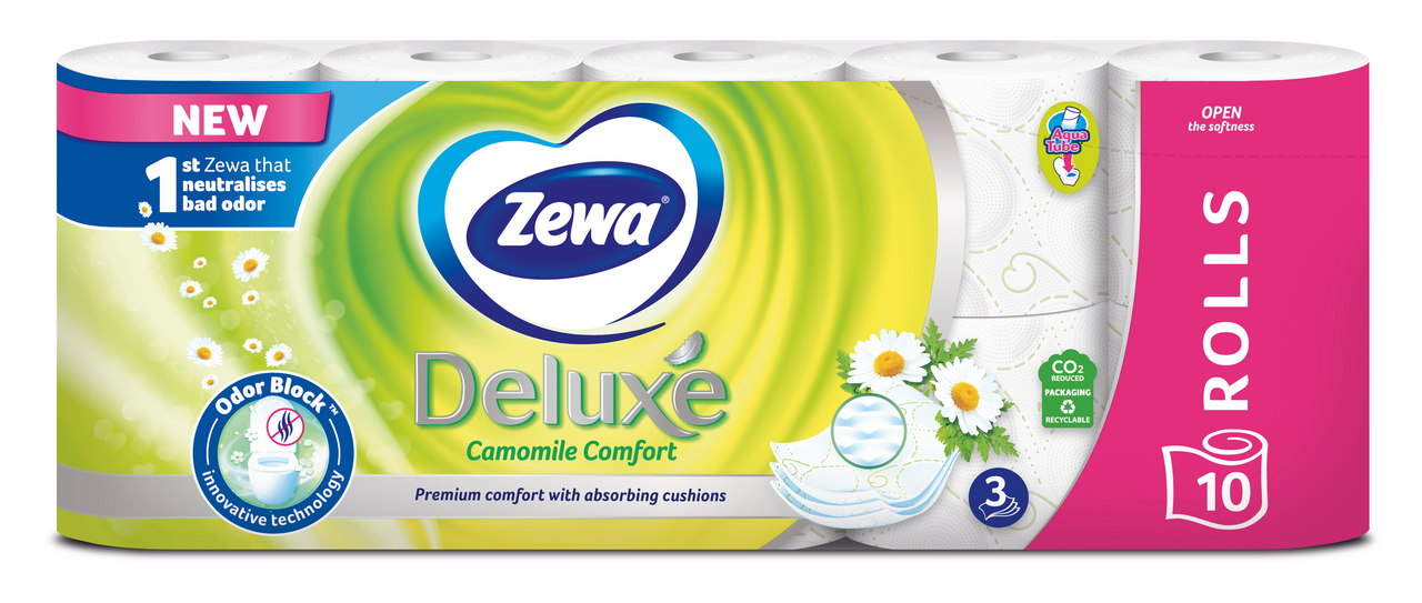 - Bílý třívrstvý toaletní papír se svěžím zeleným potiskem a skutečnou vůní heřmánku. Navíc s technologií OdorBlock™ působí heřmánková vůně jako neutralizátor zápachu, který eliminuje nepříjemné pachy ve vaší koupelně. I díky tomu se stal opravdovým favoritem v mnoha domácnostech. Logo Zewa potvrzuje na tomto jemném a zároveň pevném papíru proslulou kvalitu značky. Řada Deluxe je vyráběna z recyklovaného papíru.